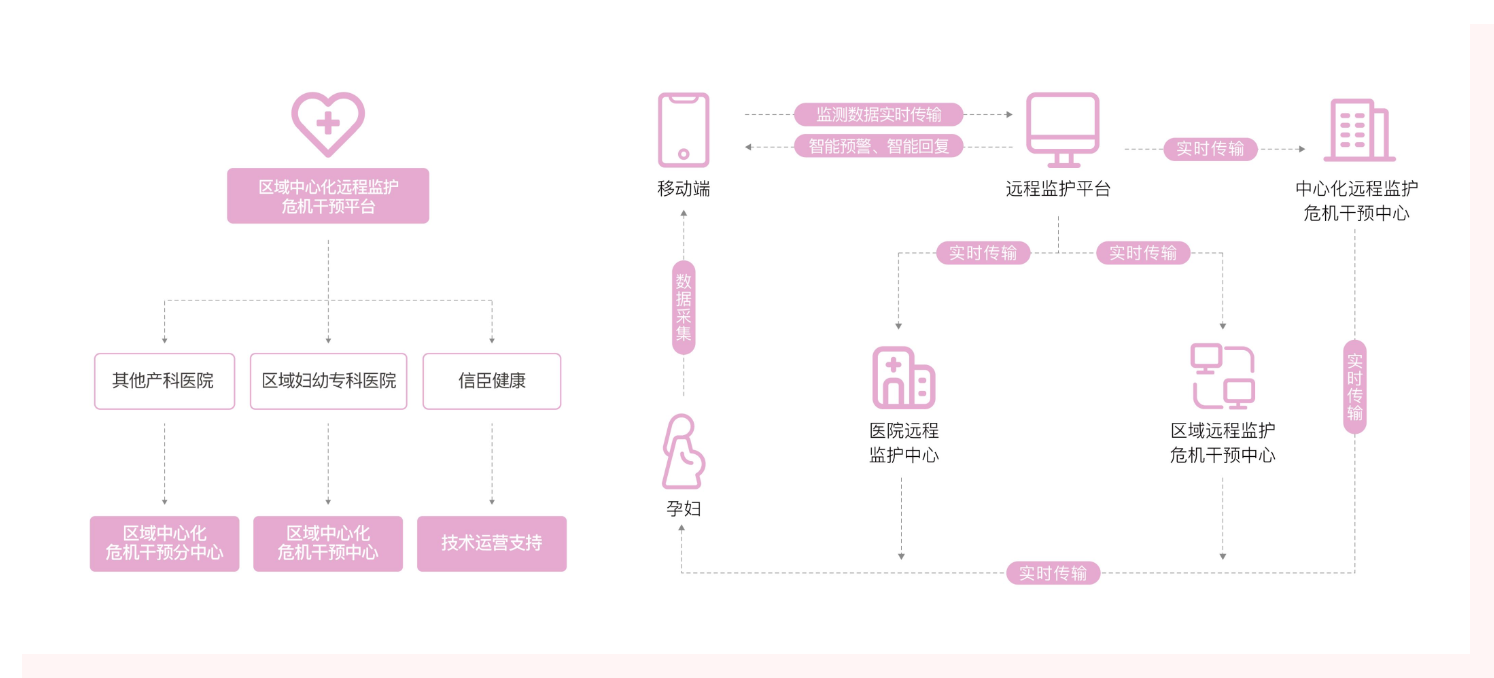 建立母婴安全远程监护平台,将胎心监护从医院门诊、病房延伸到院外,实现对胎儿的实时监护,以填补院外监护的空白,从而帮助医院实现院内、院外一体化的实时监护,保障母婴安全。