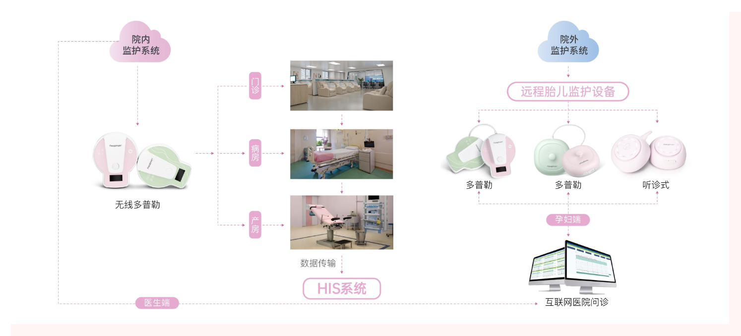 软件系统无缝对接各医院互联网医院建设,拓展目前母婴方面空白的互联网医疗服务项目。为孕产妇提供院内院外全程胎心监护服务,并可提供线上复诊和居家上门护理。缓解门诊压力,同时提高孕产妇的居家安全状况,从而降低孕妇和胎儿的死亡率。